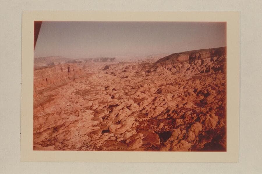 Down Forbidding Canyon; Fifty Mile Mountain at upper left; the Henry Mountains in the haze in the distance; Cummings Mesa at left