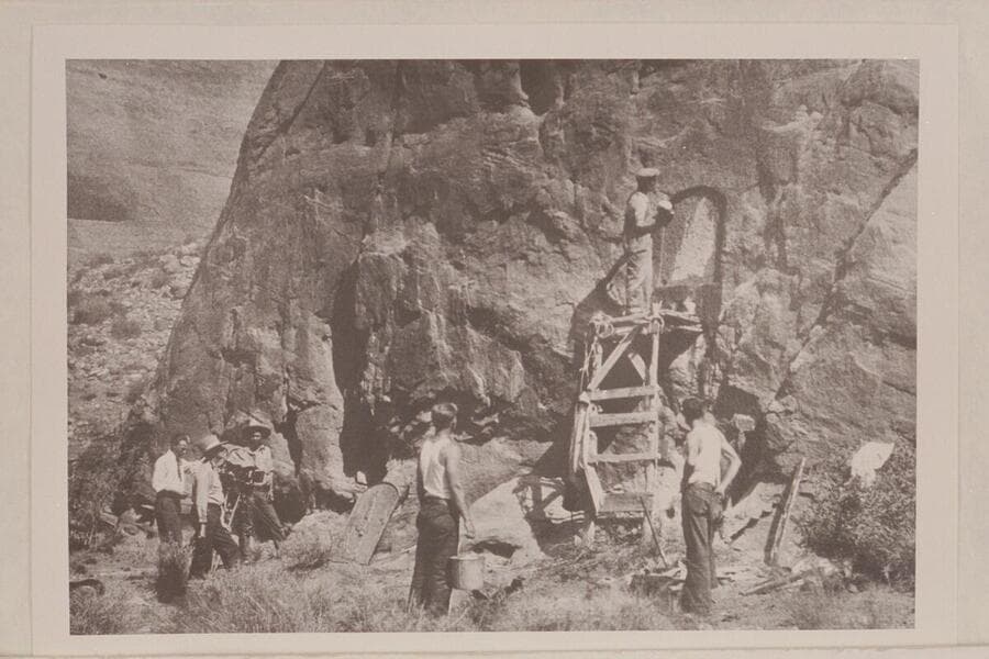 Mason cutting the wall for the plaque at Rainbow Bridge