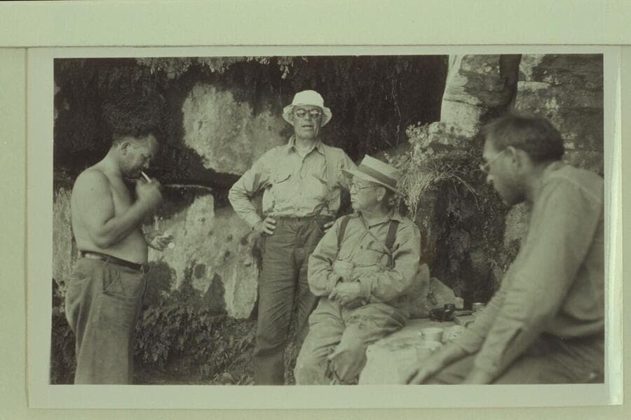Julius F. Stone after completing the Glen Canyon trip in 1938. On his right are Dr. Inglesby and William Chryst, and on his left is Dr. Russell Frazier