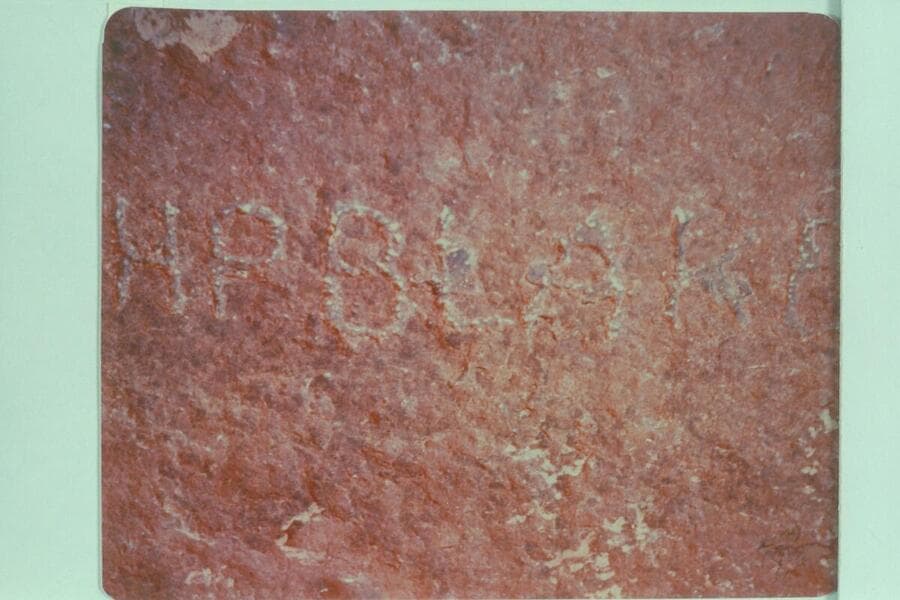 The name "H P Blake" cut near the stream at the mouth of Bridge Canyon