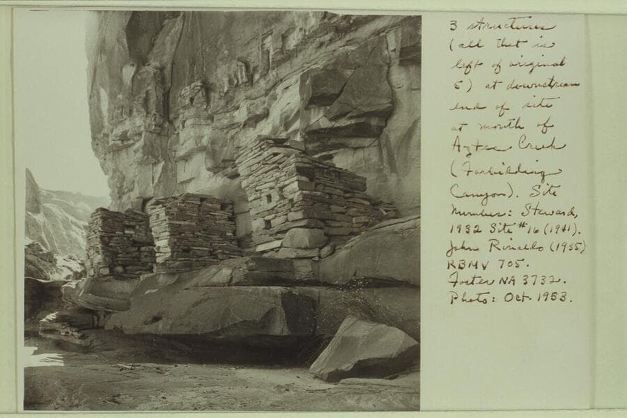 Three structures (all that is left of original five) at downstream end of site at mouth of Aztec Creek (Forbidding Canyon)