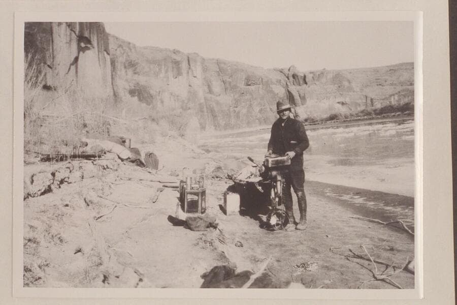 Pat Flattum and the heavily loaded outboard motorboat in Glen Canyon. From album in Wetherill collection