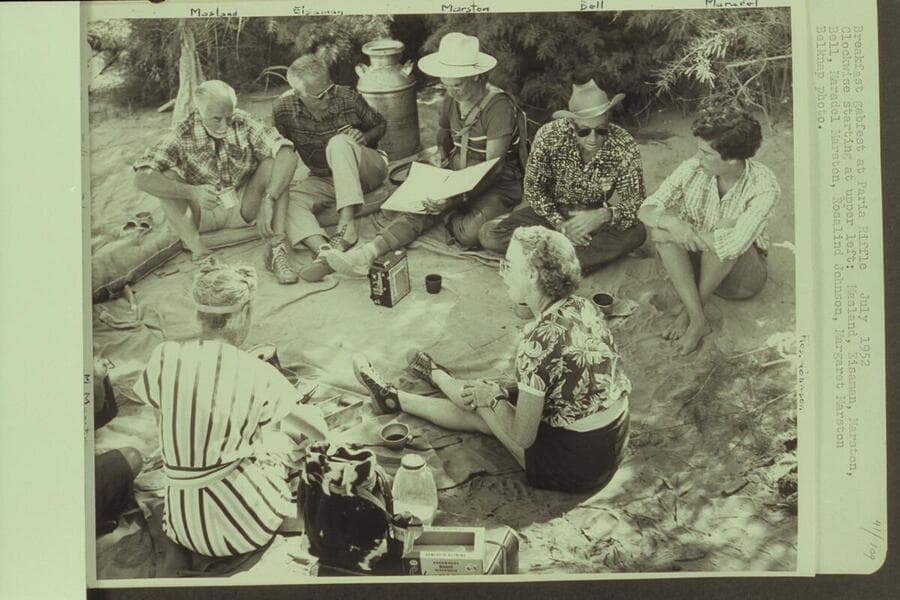 Breakfast above Paria Riffle. Upper: Masland, Eisaman, Marston, Bell, Maradel Marston; lower: Margaret Marston and Rosalind Johnson