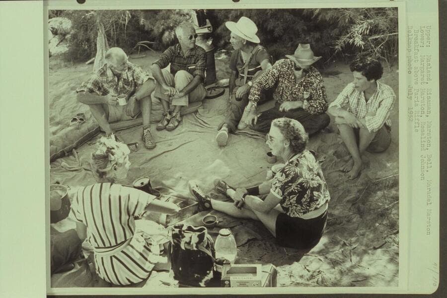 Breakfast above Paria Riffle. Upper: Masland, Eisaman, Marston, Bell, Maradel Marston; lower: Margaret Marston and Rosalind Johnson