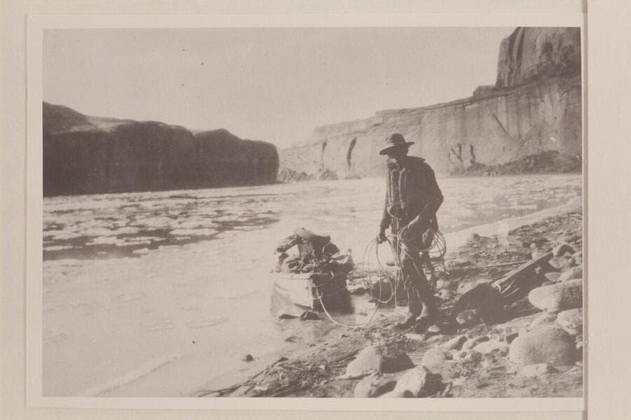 Pat Flattum and the heavily loaded outboard motorboat in Glen Canyon. From album in Wetherill collection