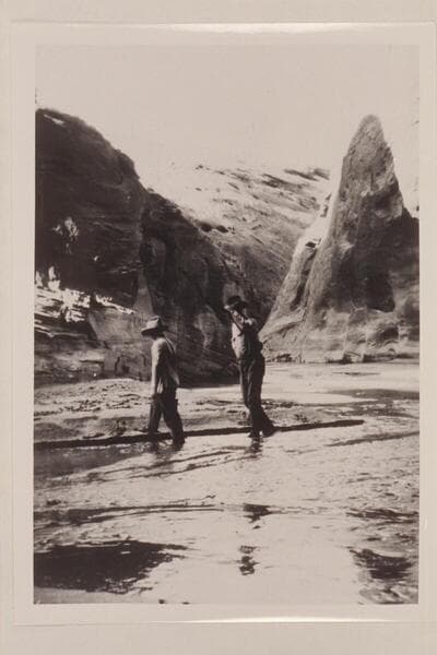 Sarah Fraser in granary near the Stone-Stanton dredge. Dave Rust at right. Mile 121 near dredge in Glen Canyon