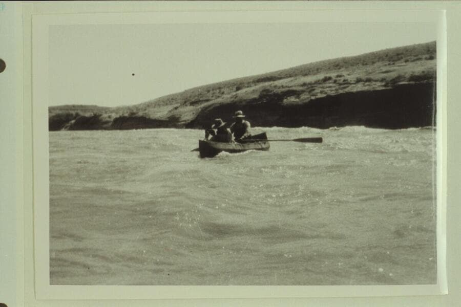 George C. Fraser sitting in the stern of one of Dave Rust's folding canvas boats. Glen Canyon. Bert Loper is at the oars as boatman for Rust