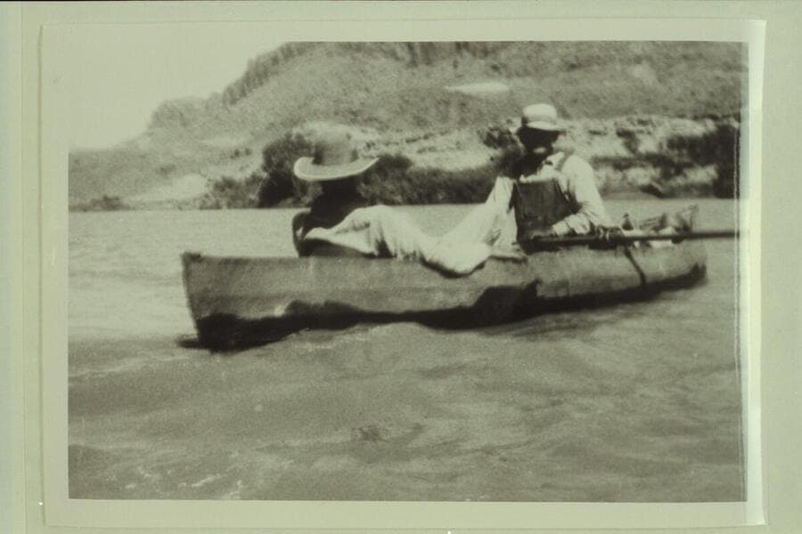 George C. Fraser sitting in the stern of one of Dave Rust's boats which is being rowed by Bert Loper; Glen Canyon