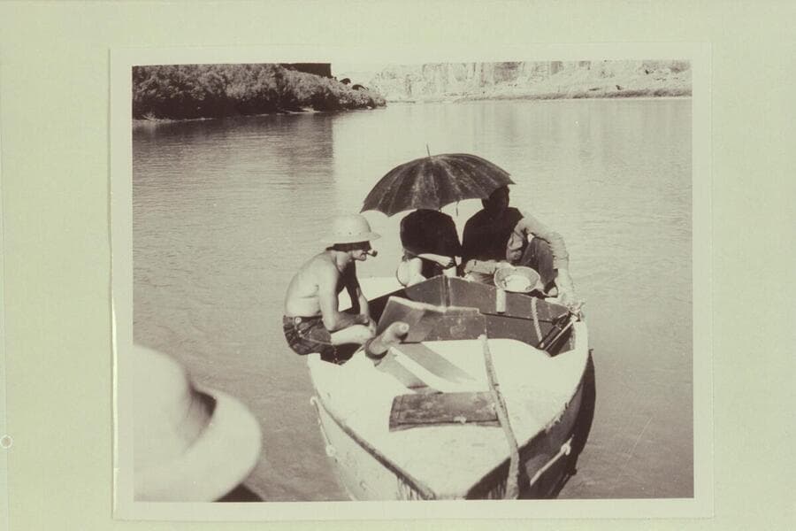 In Glen Canyon near Warm Creek. The boats were being towed by an outboard motor on the Wen. Nevills 1940 party. Del Reed sits at left