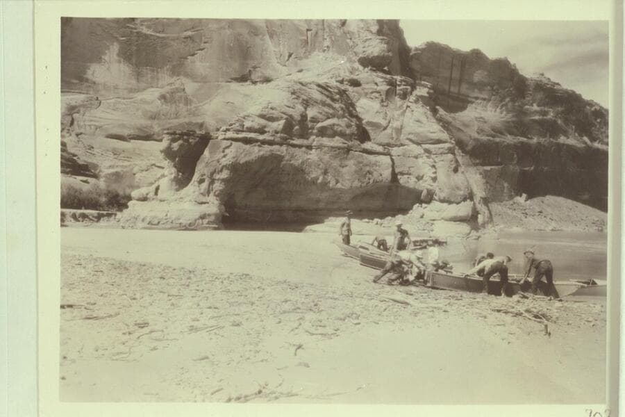 Camp at Warm Creek--Glen Canyon. RB-MV Expedition. Photo 670. Warm Creek is Mile 27.8. Horses in brush used for steamer construction