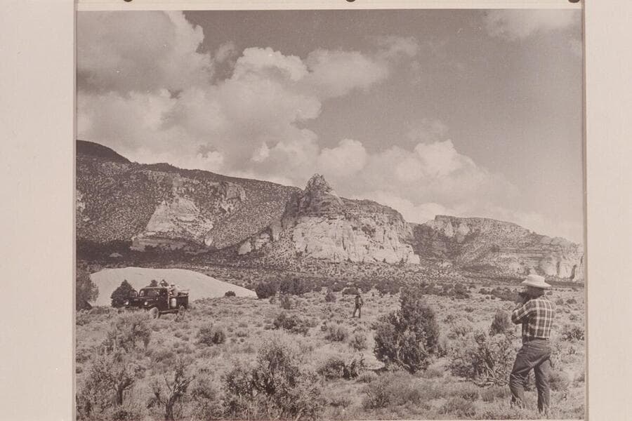 Sandstone butte on Rainbow Mesa near foot of Navajo Mountain. Bill Belknap with the camera at right