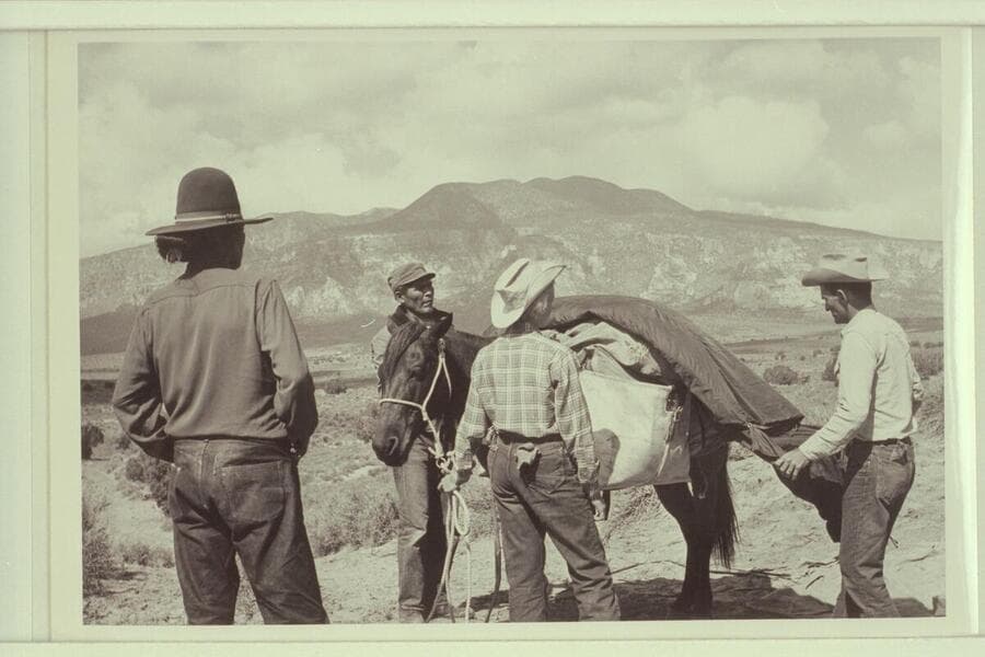 White-hat, Bahe, Nancy and Tom Daly pack for the trip to Arch in the Sky. Navajo Mountain in the background