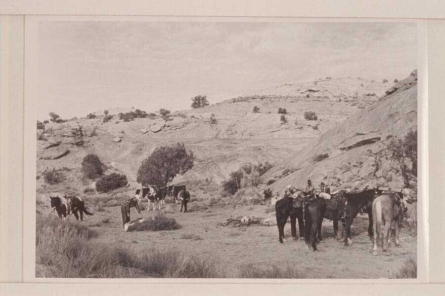 Camp the first night in Navajo Canyon. Bill Belknap at left. Jorgen Visbak ties on his saddle bags. Buck White-hat watches Nancy Daly in the background
