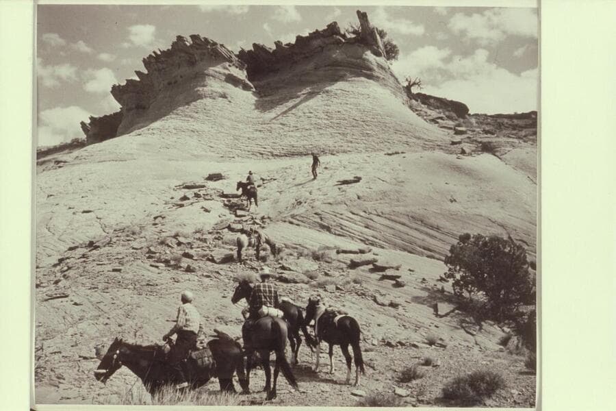 Down the slickrock from the mesa in front of Arch in the Sky at the edge of Navajo Canyon, Arizona. Left to right: Tom Daly; Buck White-hat; Bahe