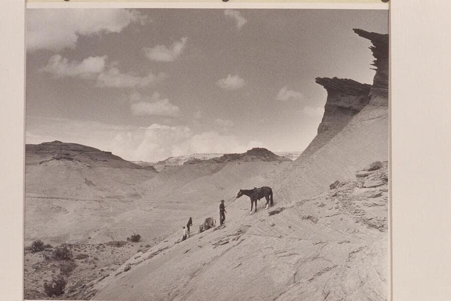 Down the slickrock from the mesa in front of Arch in the Sky at the edge of Navajo Canyon, Arizona. Left to right: Tom Daly; Buck White-hat; Bahe