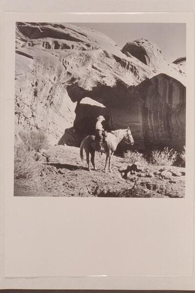 Nancy Daly sits her horse in front of the natural bridge in a side canyon of Navajo Canyon, Arizona. The bridge may have been a discovery on 1954, Sep. 26 when this photo was taken Masland suggests naming the bridge White-hat Bridge