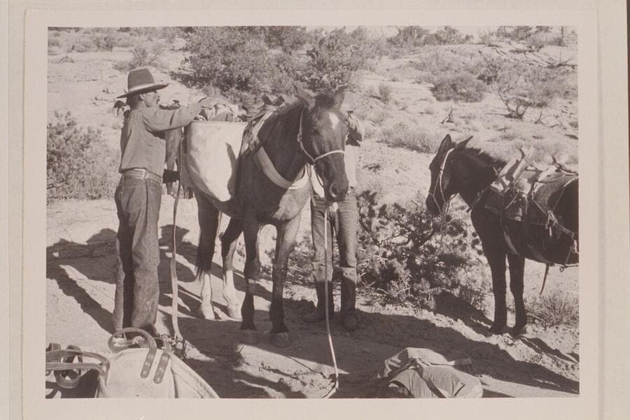 Preparing the packs for the drop into Navajo Canyon. Buck Whitehat; Nancy Daly; F. E. Masland; Tom Daly; Jorgen Visbak; Bill Belknap