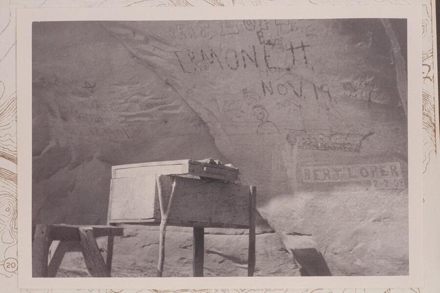 Autographs and dates on wall of cave. The name Bert Loper is cut in the sandstone
