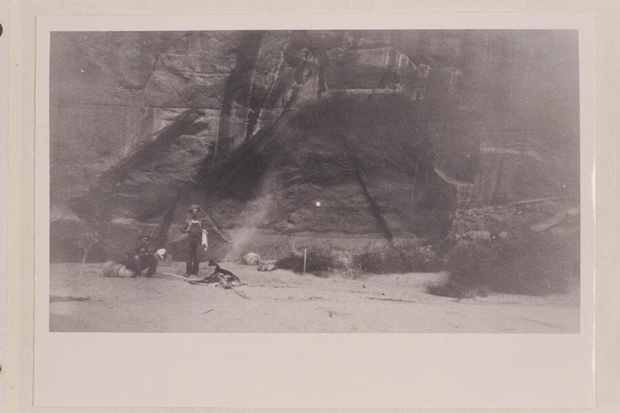 Bert Loper's Cave. Loper is standing by the fire. The figure on the bedroll appears to be Christensen. Wright Bar opposite Navajo Creek, Colorado