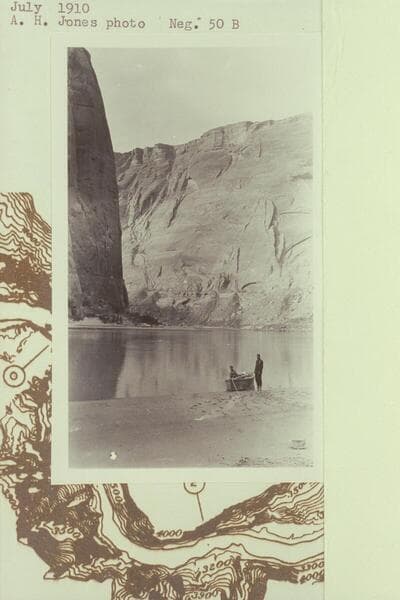The skiff "W. H. Bradley" with McDermid and Nungesser. Built at Lees Ferry in 1910 and towed up to Mile 105 in Glen Canyon by "The Canopy," August 1910