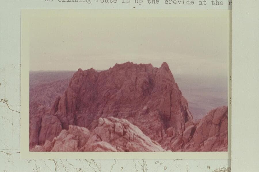The South Echo Peak from the North Echo Peak. The climbing route is up the crevice at the right