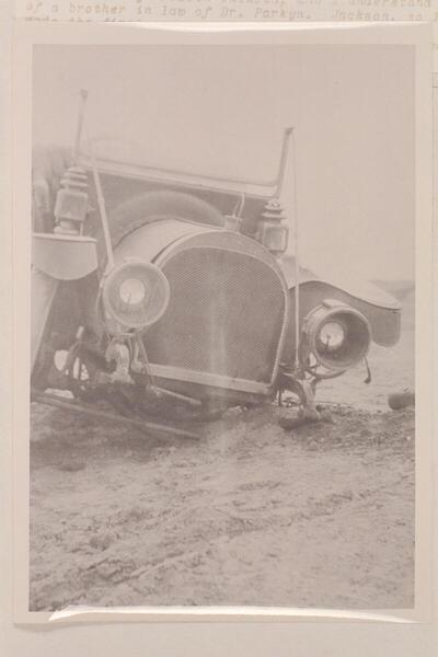 First car from Flagstaff to Lees Ferry. A Kissel. Broke down and a wheel came off. From Spencer collection, p.70