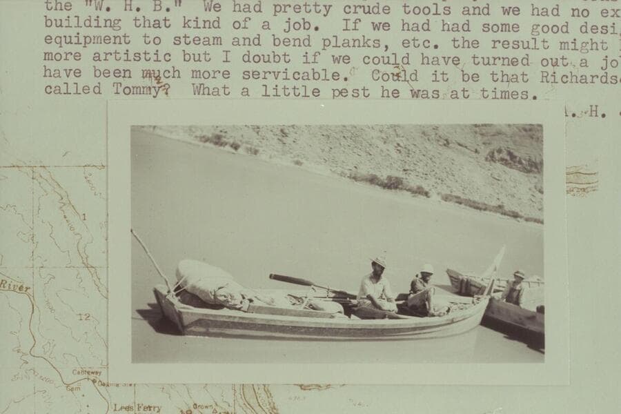 The skiff "W. H. Bradley" with McDermid and Nungesser. Built at Lees Ferry in 1910 and towed up to Mile 105 in Glen Canyon by "The Canopy," August 1910