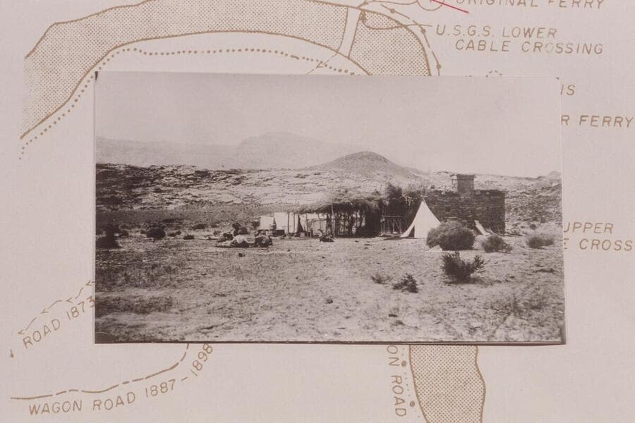 The shelter in front of the Fort at Lees Ferry and the Spencer camp tents beyond