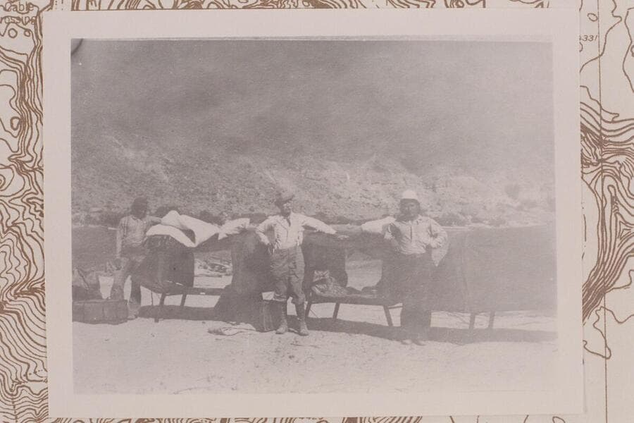 Cots at Lees Ferry brought in by Parkyn, Lovett, and Daniels. Tom Lovett is center between Navajos. Copy of print #15 in Waller collection