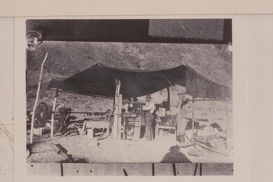 Machine shop on north side at Lees Ferry where dredge was assembled; Richardson and Lovett