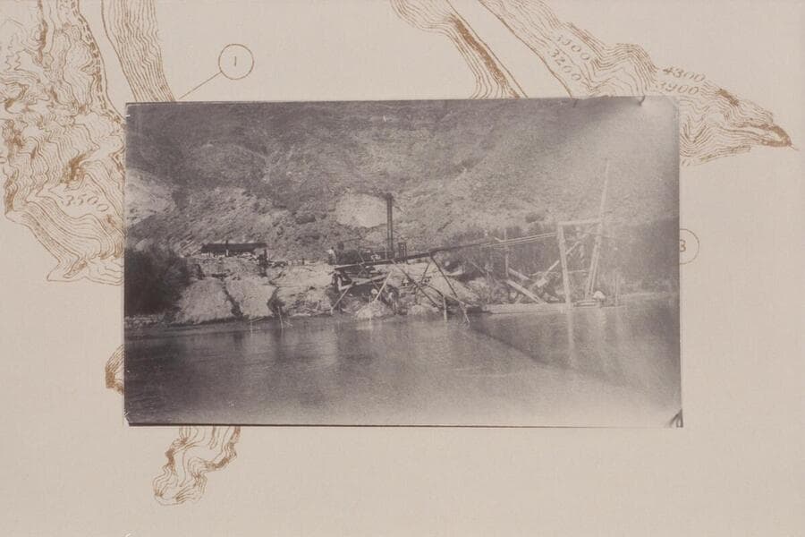 Lovett pneumatic pipe dredge suspended at outer end of flume preparatory to operation