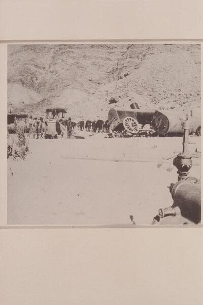 Unloading boilers at Lees Ferry; Spencer placer operation. The large steam pumps are at the right