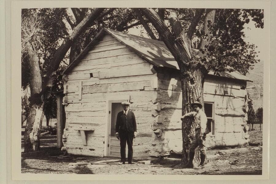 Robert Burns Hildrebrand and Charles Kelly at the original Lee cabin, Lees Ferry