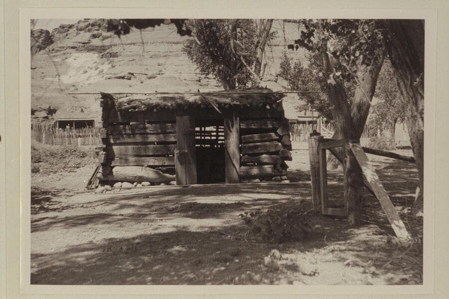 Machine shop on north side at Lees Ferry where dredge was assembled; Richardson and Lovett