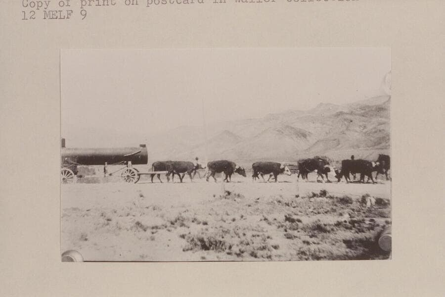 Spencer ox teams hooked to wagon loaded with boiler at Marysvale, Utah