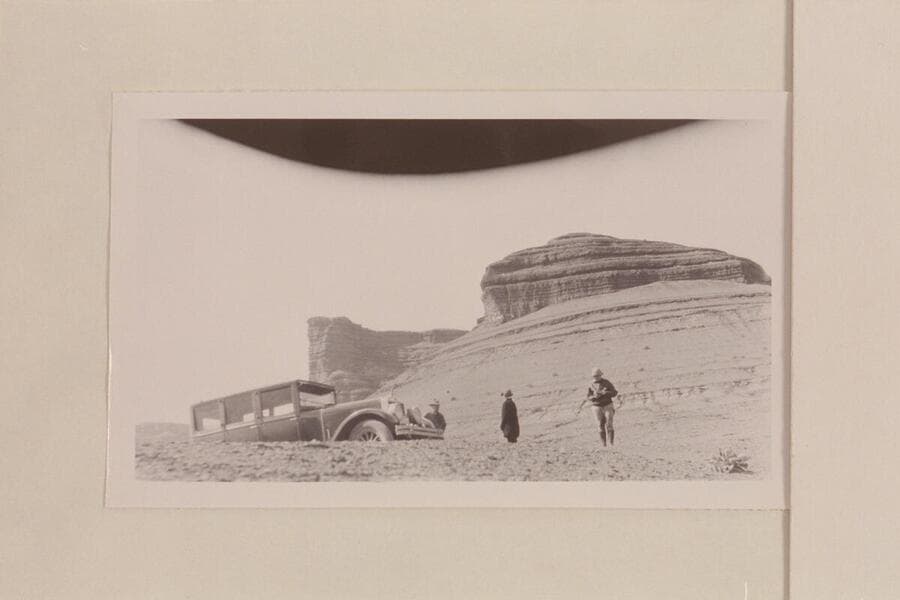 Zahn party under shelter at Lees Ferry. The Zahn car in the background