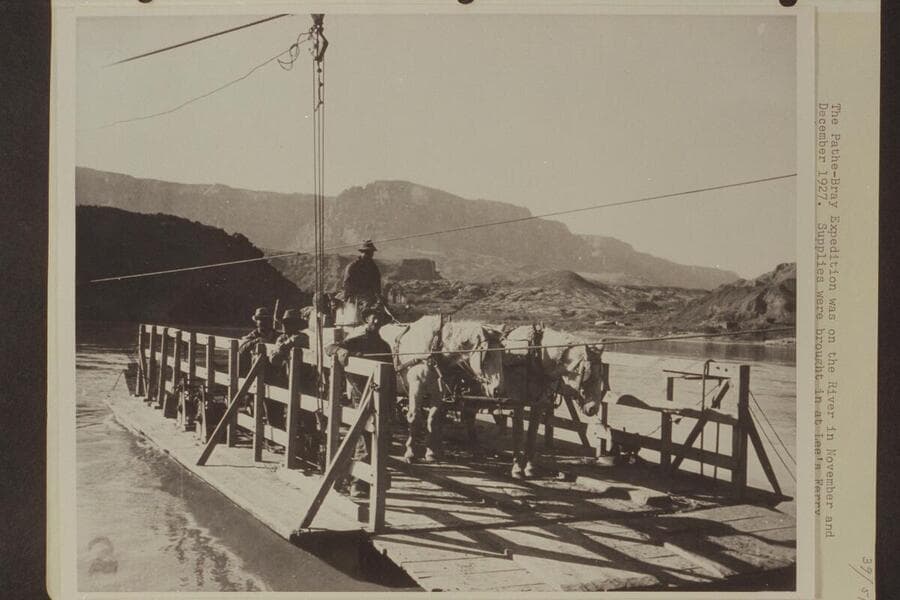 The Pathe-Bray Expedition was on the river in November and December 1927. Supplies were brought in at Lees Ferry and transported across the river in the manner shown here. The man nearest the camera operated the ferry