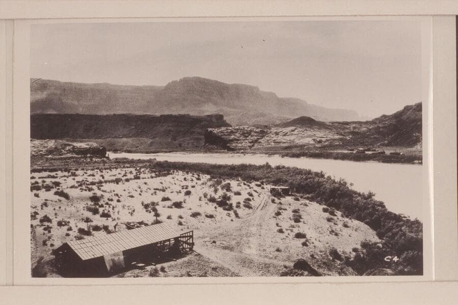 The boat house at Lees Ferry with the Vermillion Cliffs in the background