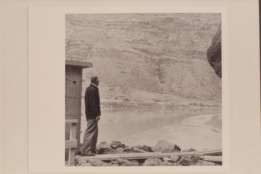 Harry Aleson stands at the gauge on the left bank at Lees Ferry and looks across the river to the old Spencer Mining buildings