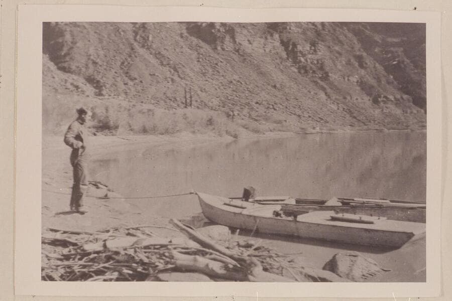Jerry Johnson looking at the two Russell-Tadje boats at Lees Ferry