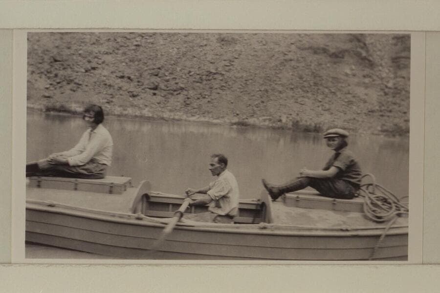 Prior to 1923 USGS cruise at Lees Ferry. Burchard; Moore; Kolb; Catherine Paul; Edith Kolb. Print from Freeman collection