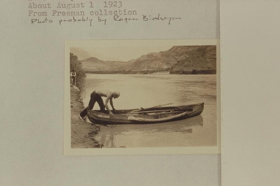 Frank Dodge in the folding canvas boat "Mojave" as the USGS 1923 party left Lees Ferry. The boat was wrecked while lining Cave Springs Rapid