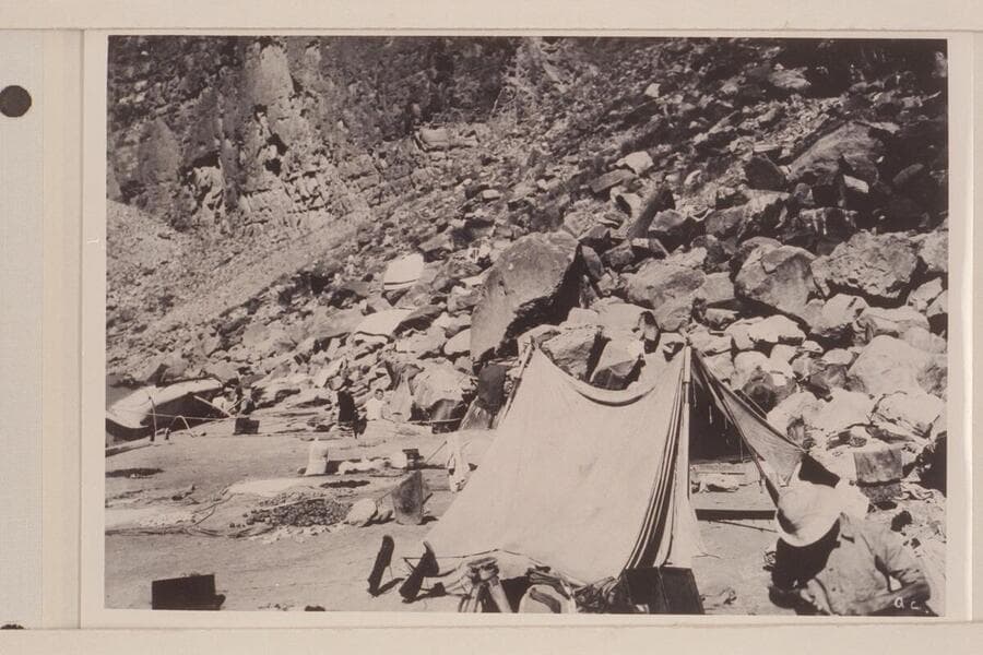 Eddy's boat "Powell" rolled on shore. She capsized when being lined in Cataract Canyon at the head of The Big Drop. Note food and clothing out to dry. From Carey collection