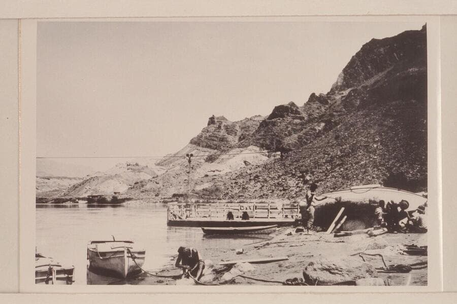 The heavy boats of the Eddy Expedition being overhauled at Lees Ferry. The "Powell" shows at left. The "Coronado" is center and the "Dellenbaugh" is on the beach. Copied from Carey collection