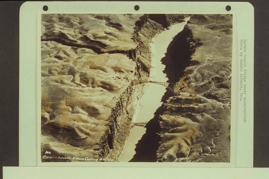Marble Canyon Bridge under construction. The work on the bridge started August of 1927 and was completed January of 1929. Print from Freeman collection