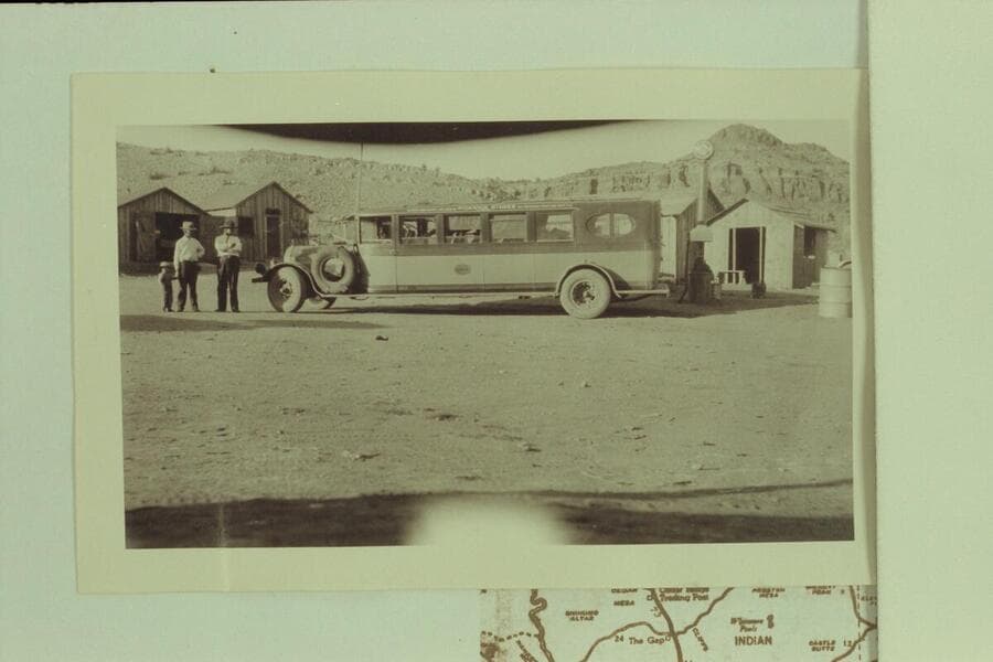 Bus on road between Cameron and the Navajo Bridge at time of the dedication of the Bridge. Print from Freeman collection