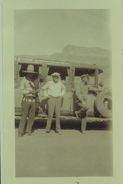 Bus at the dedication of the Marble Canyon Bridge. Print from the Freeman collection