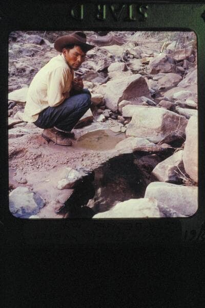 Bahe examines the clear and the black water in Black Water Creek just below Black Water Cave. North side of Navajo Mountain