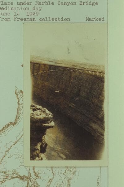 Plane under Marble Canyon Bridge. Dedication day. From Freeman collection. Marked USED Oct 1929