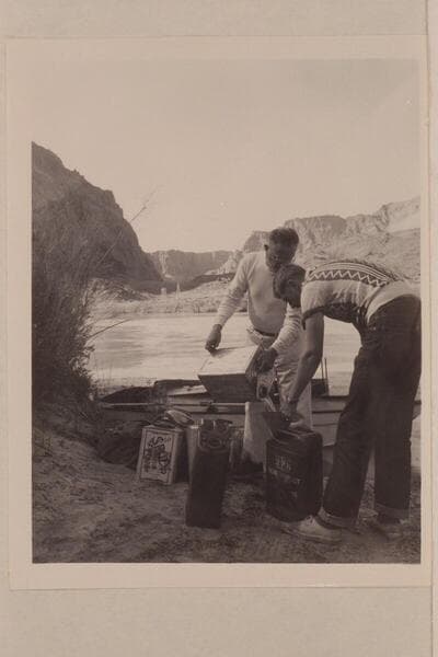 Willie Taylor and Edward Hudson fueling the "Esmeralda" prior to the start from Lees Ferry